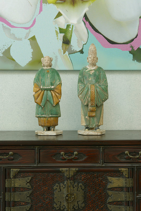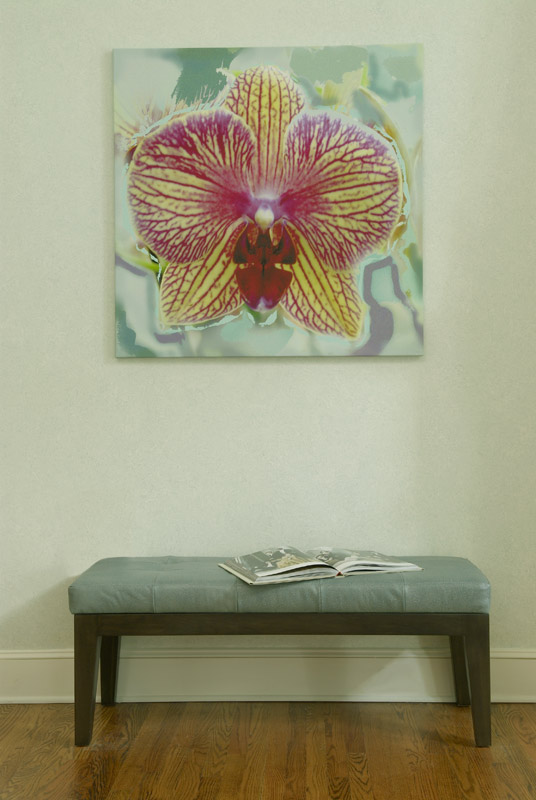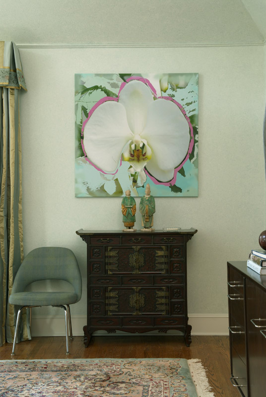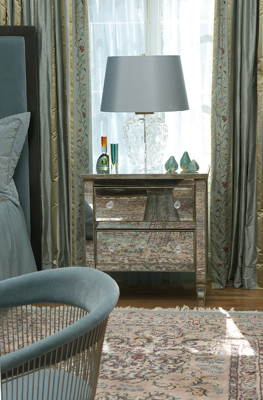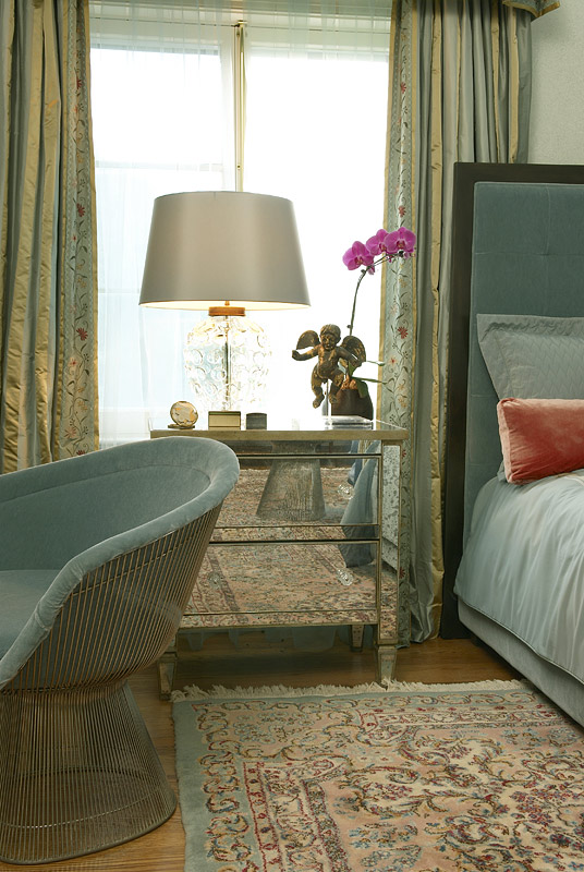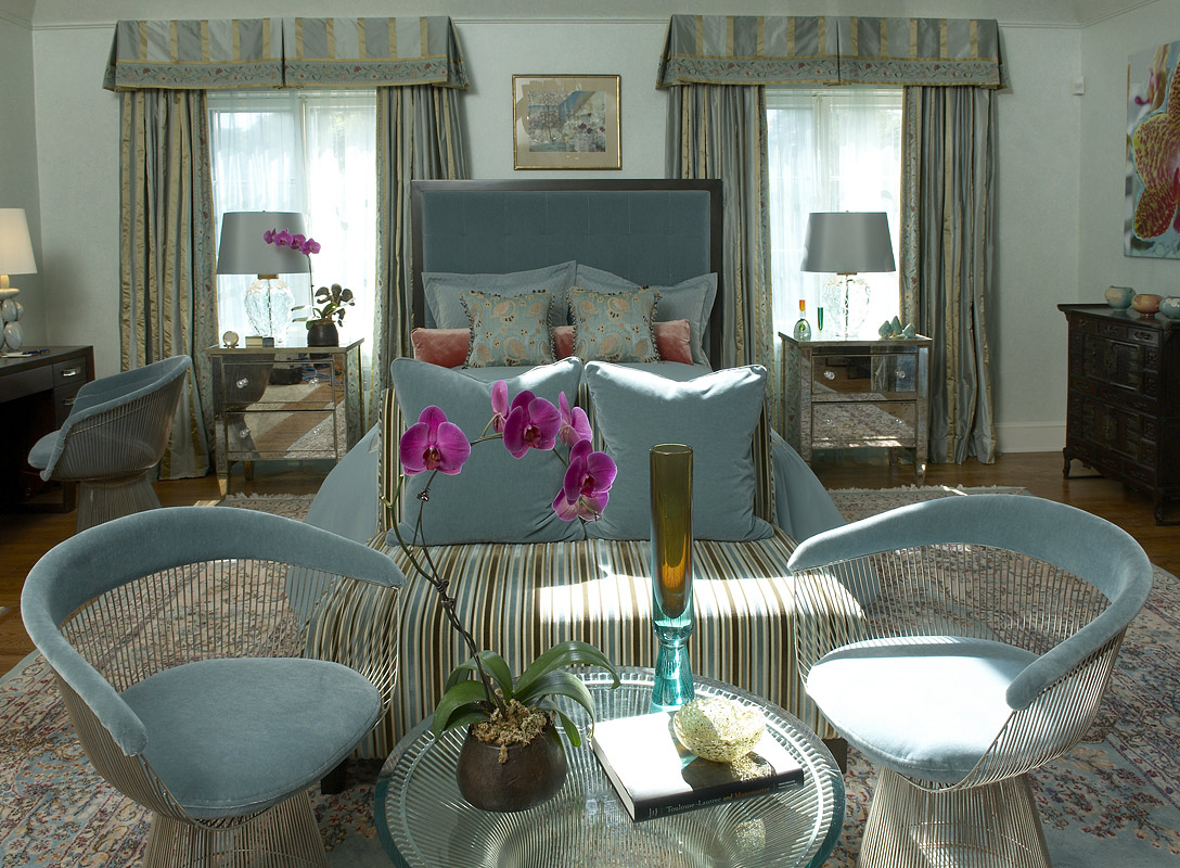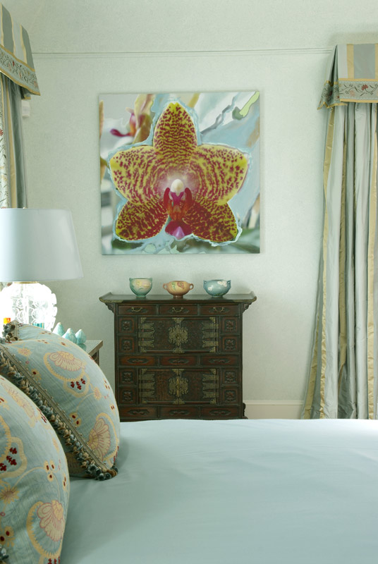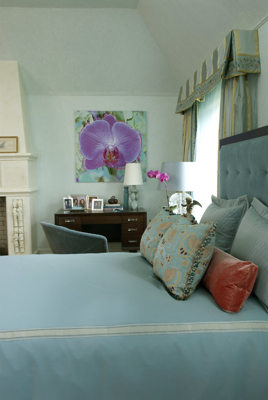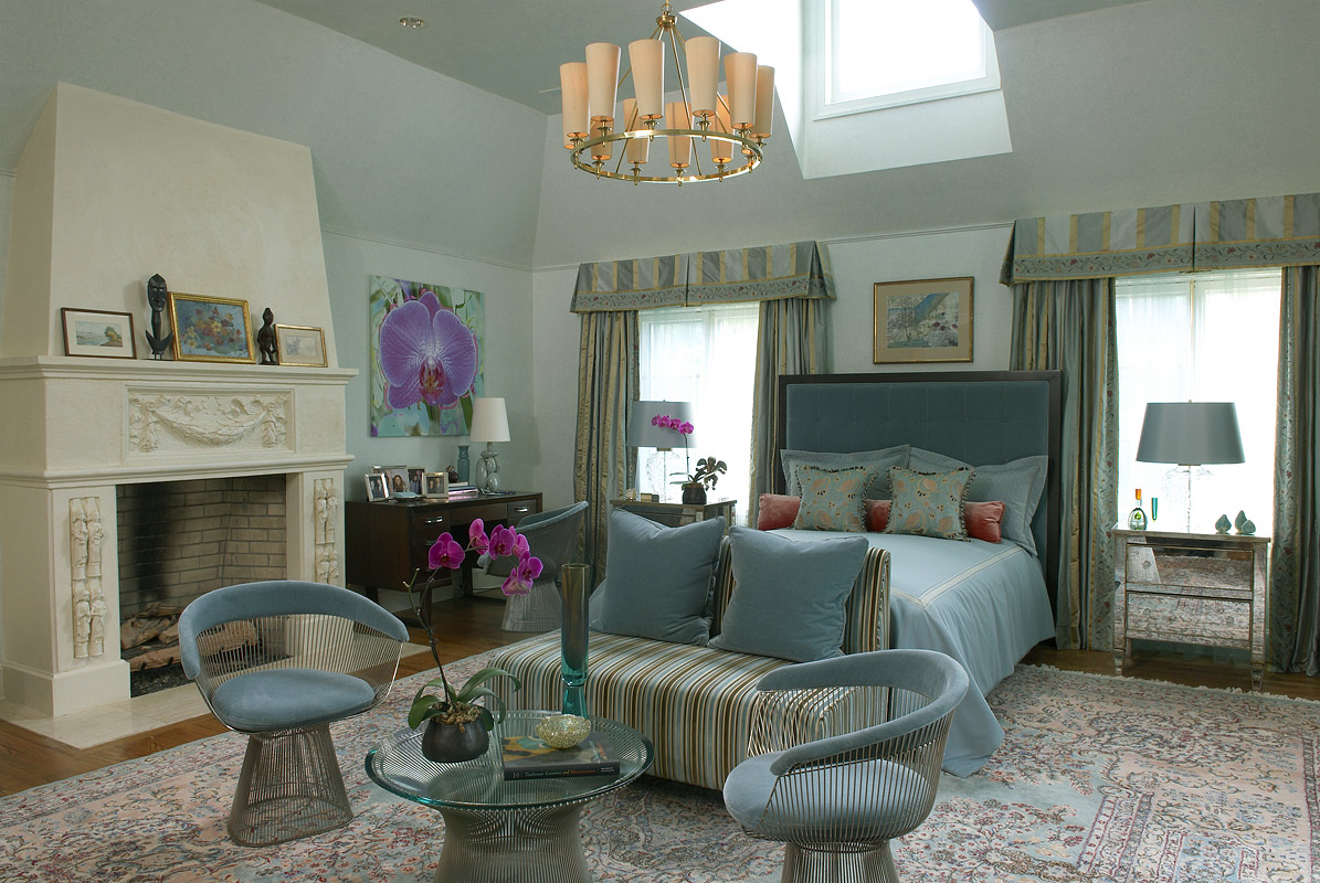 | This expansive master suite was inspired by the antique, wonderfully colored Kermin rug. It's lovely tones created a perfect mix of color to enhance the art work and fabrics that invitie you into this calming retreat. |