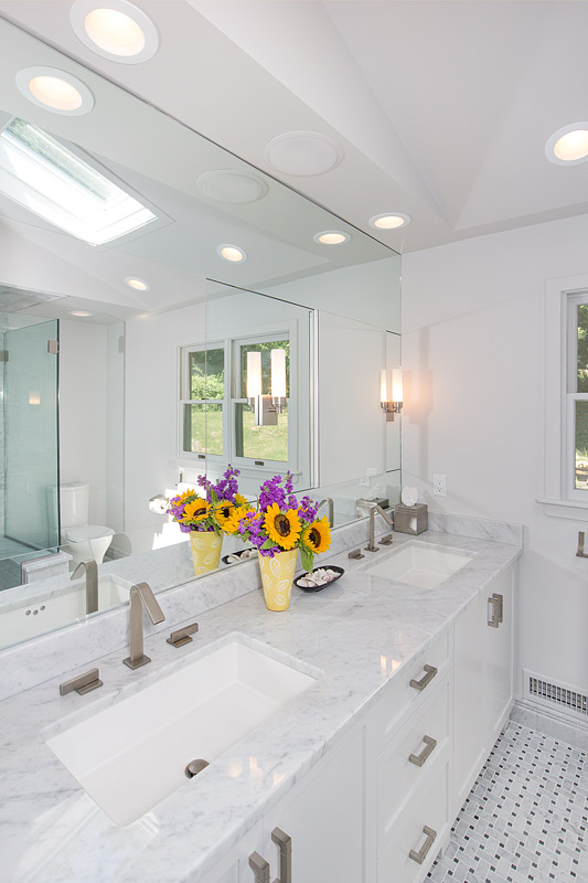 The complete master bath and guest bath room renovation was inspired by the cool gray color of Carrera marble from Artistic Tile. The spacious bathrooms are outfitted with brushed nickel Kohler and polished chrome Brizio bath products that accentuate the cool, sleek and peaceful color scheme. |
